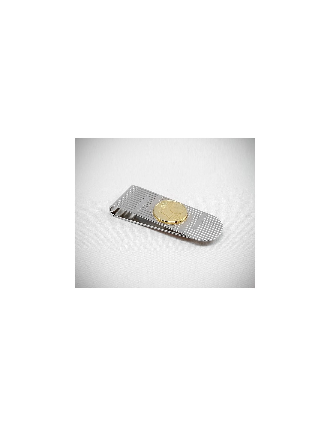 Un fermasoldi dalla classica forma a clip arricchito da una incisione geometrica e dall'applicazione di una vera moneta di centesimo di euro dorata in bagno d'oro 24 Kt. Un binomio perfetto tra eleganza e praticità. Made in Italy