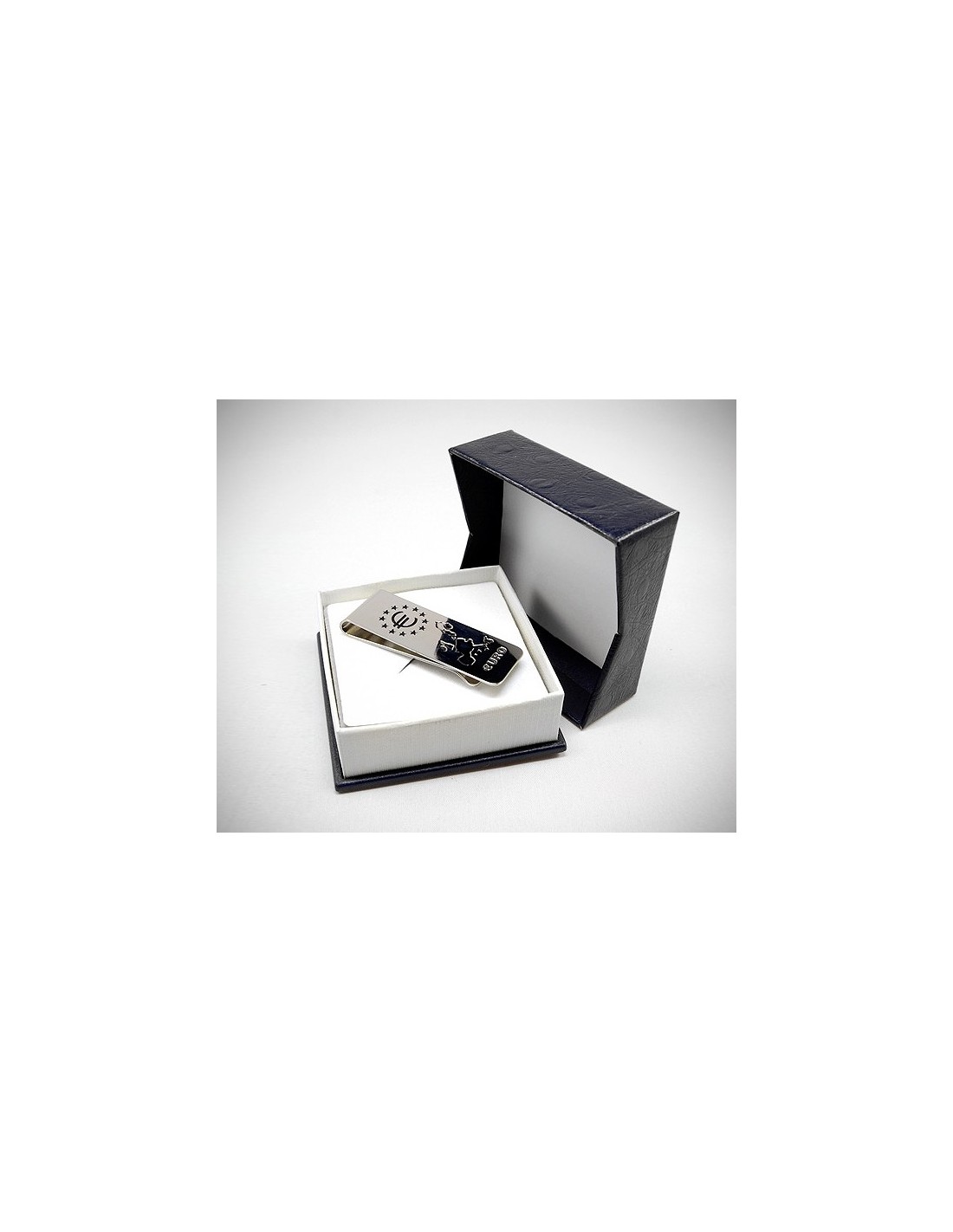 Un fermasoldi dalla forma squadrata accoglie diverse incisioni che rappresentano l'euro e l'Europa. l'accessorio ideale per chi vuole unire la praticità allo stile. Made in Italy